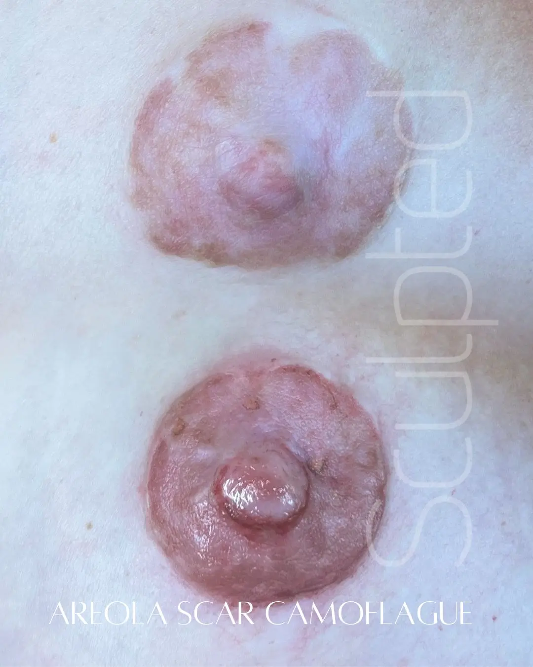 Using highly specilized tattoo techniques and color application we can brighten or Enhance the color of your areola. The same techniques can be used to blend hypopigmented (lighter that the area around it/ white) scars caused by breast augmentation.